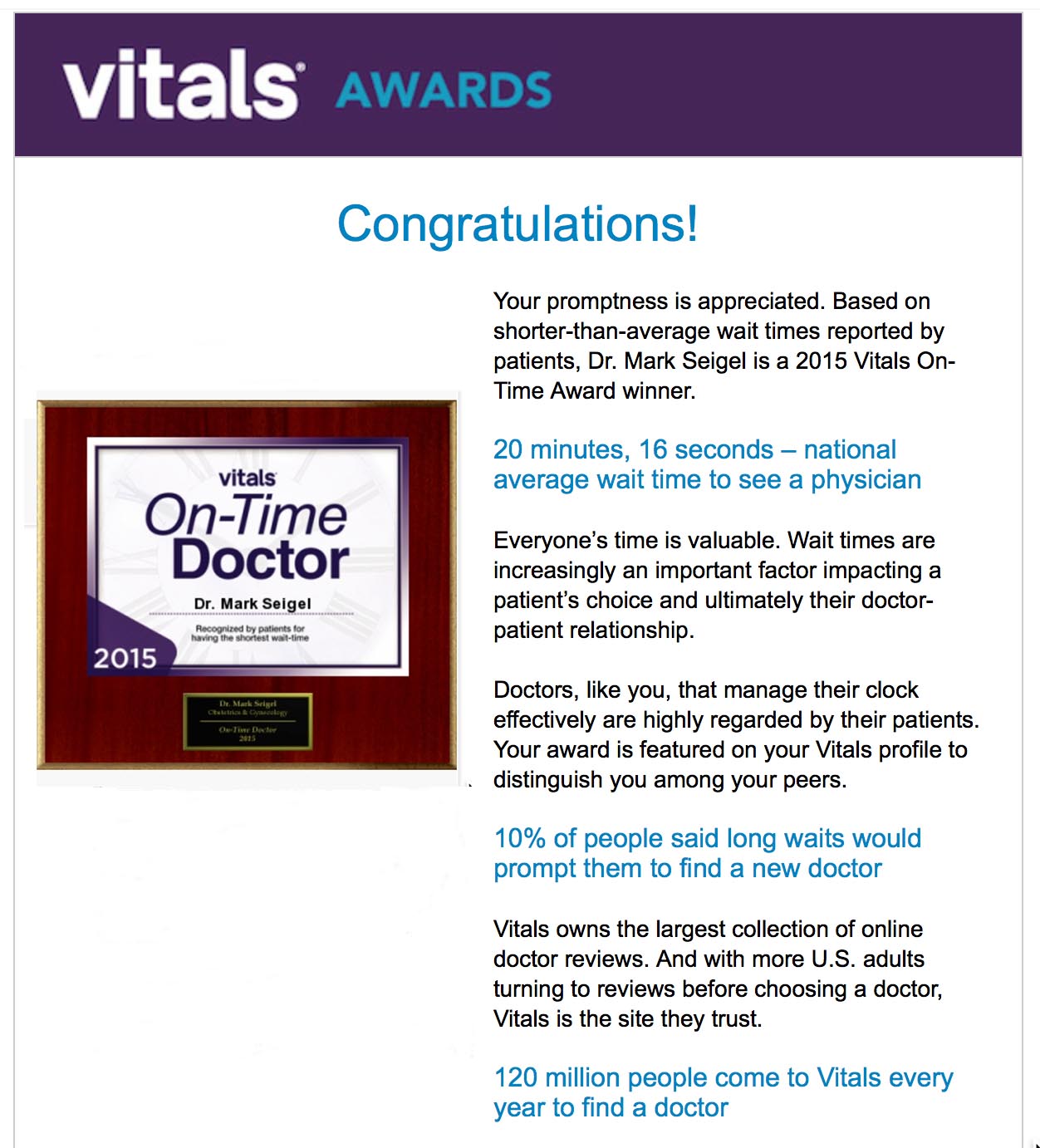 Dr. Seigel also was given an award by Vitals for being an On-Time Doctor: